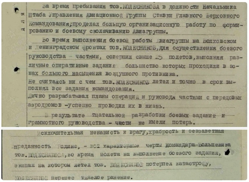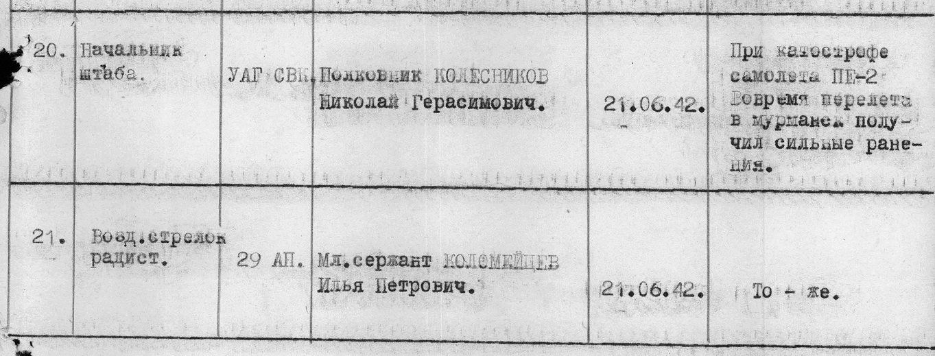 В этот же день, во время перелета на Север потерпел катастрофу самолет Пе-2, в котором летел начальник штаба УАГ СВГК полковник Колесников Николай Герасимович. Он, и воздушный стрелок-радист младший сержант Коломейцев Илья Петрович получили тяжелые ранения.