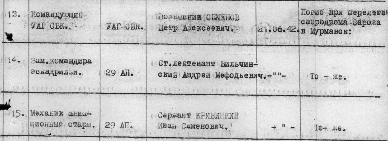 21.06.1942 г. при перелете с аэродрома Сарожа в Мурманск пропал без вести самолет Пе-2 из состава 29-го БАП УАГ СВГК, на котором летел Командующий УАГ СВГК полковник Семенов Петр Алексеевич. Вместе с ним погибли заместитель командира эскадрильи старший лейтенант Бильчинский Андрей Мефодьевич и старший механик авиационный сержант Кривицкий Иван Семенович.