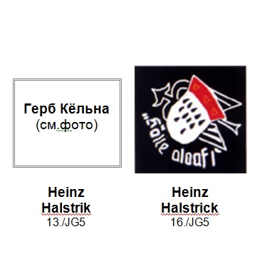igor писал(а):Фельдфебель Хайнц Хастрик был родом из Кельна, поэтому видимо на всех самолетах рисовал родной герб. Служил в 13 штаффеле, а с начала декабря 1944 г. - в 16-м.