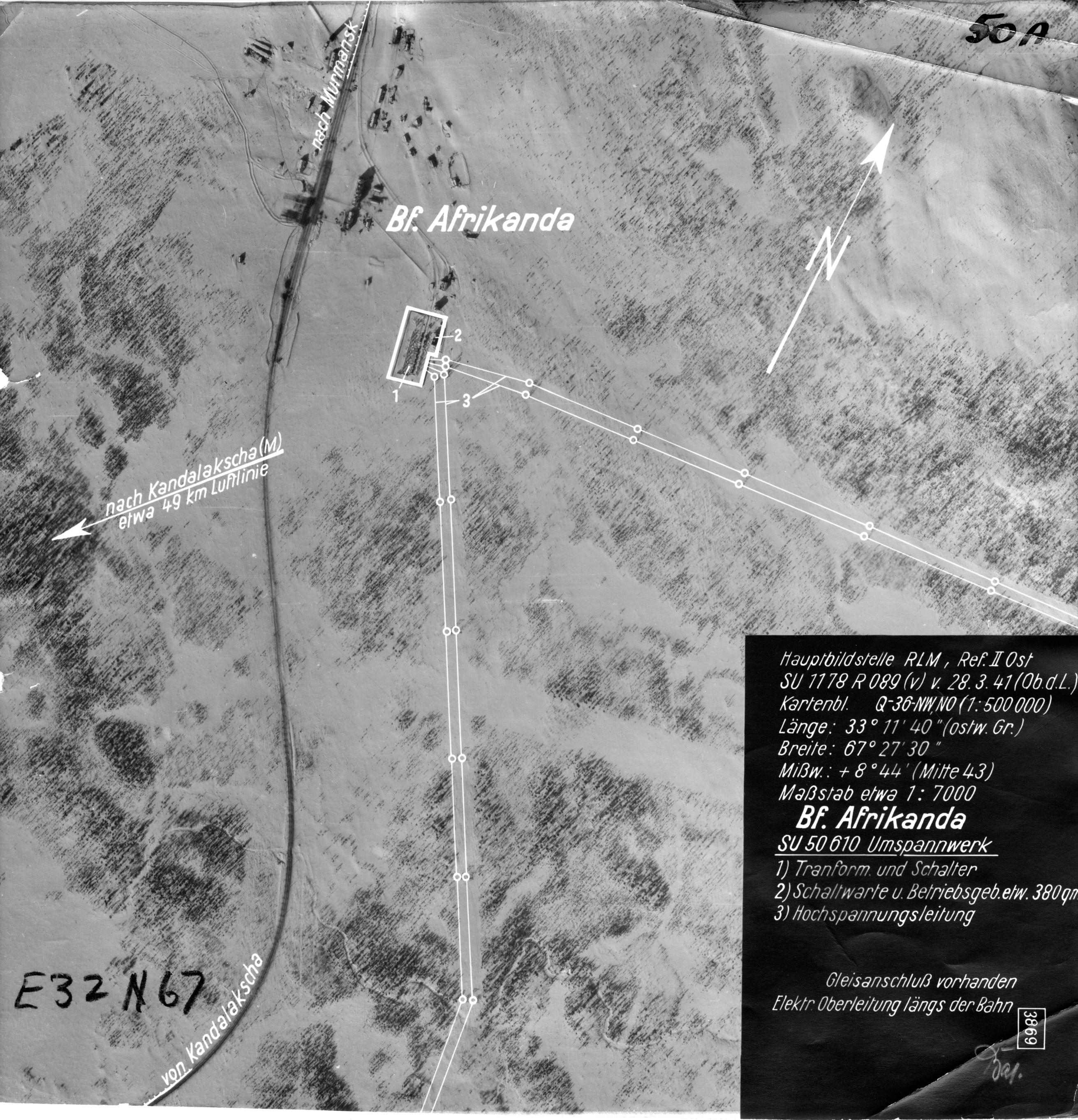 Для "разогрева" темы, и что из собственного багажа имеется. Скажем вот, есть авиаразведснимок датированный мартом 41-го. В топографическом определении что же это - уже ляп. На снимке не станция Африканда, а находящаяся неподалёку станция Охтоканда (Охто-канда), или же, как её к тому времени уже переименовали, - станция Питкуль. Тем не менее в то время объект стратегический, - на снимке запечатлена крупная электрораспределительная подстанция, поставлявшая (и функционирующая до сих пор!) электроэнергию в центральные районы Кольского п-ва от каскада Нивских ГЭС.