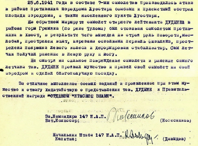 Не смотря на сильное повреждение самолета и ранение самого летчика тов.Дудник проявил мужество и привел свой самолет на свой аэродром и сделал посадку..."