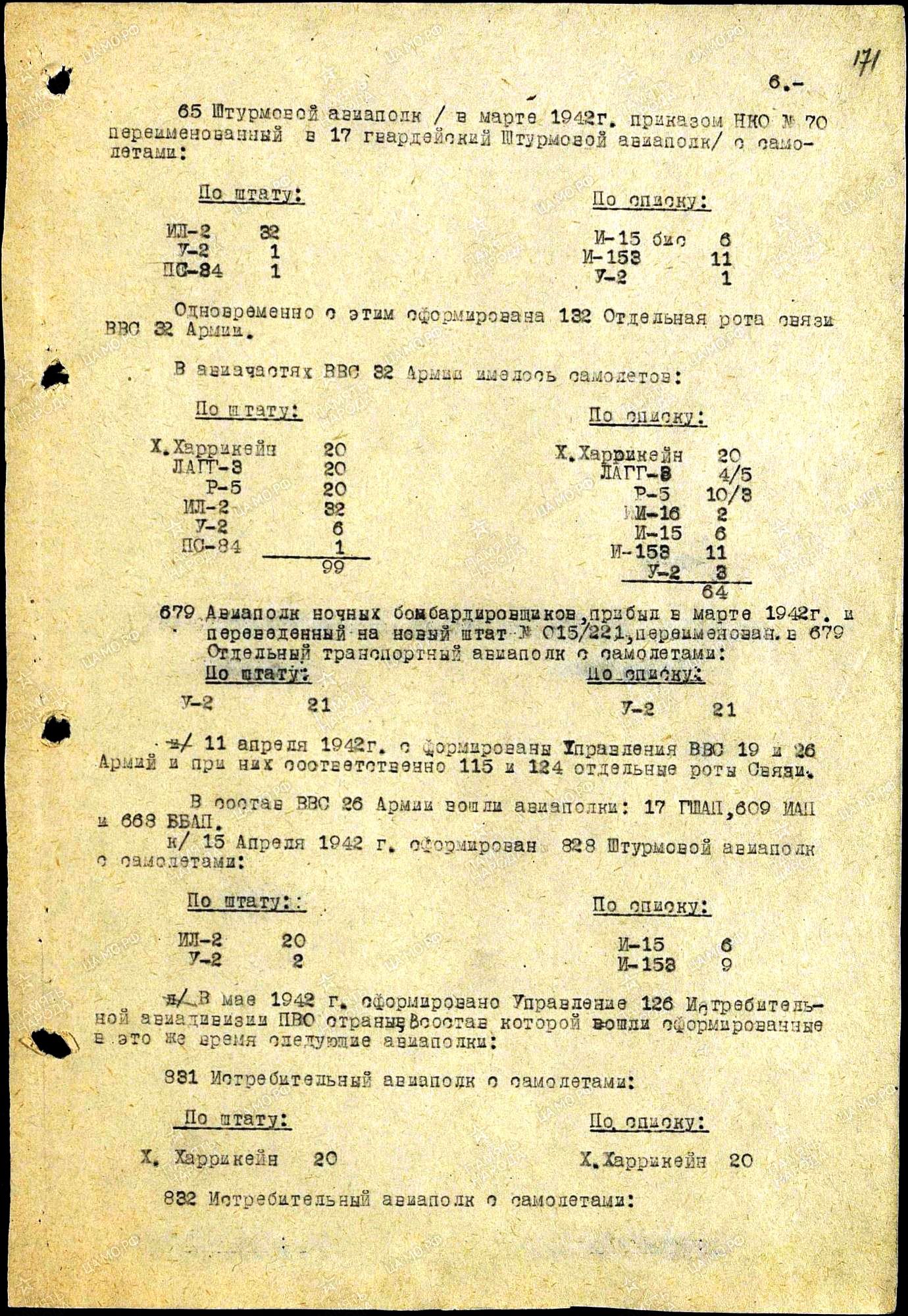 Спасибо за такое количество материала. Понятно, почему Харрикейн без номера считали принадлежащим 767 иап. Капитан В.П. Горюн, как отмечено в ЖБД полка за февраль и март 1942г., до 17 гшап служил в 767 полку. На конец марта 1942 в 767 иап всего 6 исправных самолетов. А если взять вот этот документ - "Материал к истории боевых действий ВВС КарФ - 7 ВА в Отечественной войне", то в нем видно, что на март месяц в 65 шап (ставшем в марте 17 гшап) Харрикейнов вообще нет.