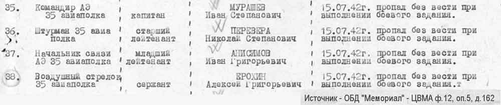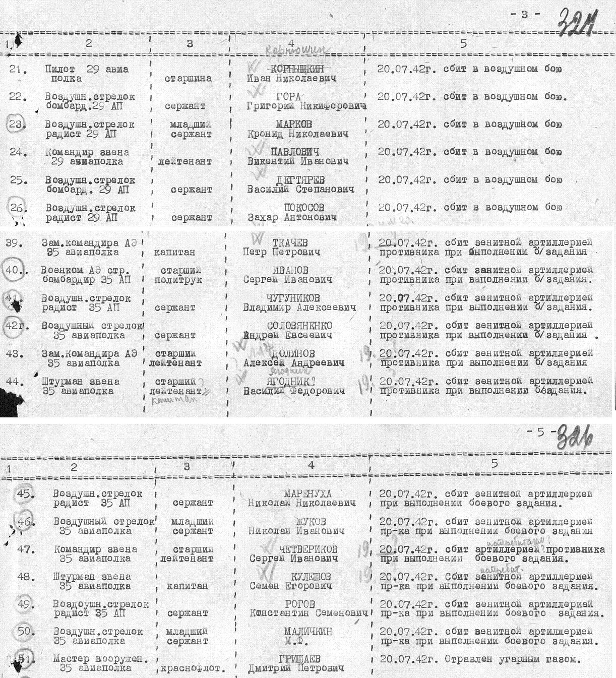- самолет ДБ-3ф из состава 35-го БАП - сбит в районе Ло-фьорд - экипаж (заместитель командира эскадрильи капитан Ткачев Петр Петрович, военком эскадрильи стрелок бомбардир старший политрук Иванов Сергей Иванович, воздушный стрелок радист сержант Маренуха Николай Николаевич, воздушный стрелок младший сержант Жуков Николай Иванович) погиб;
