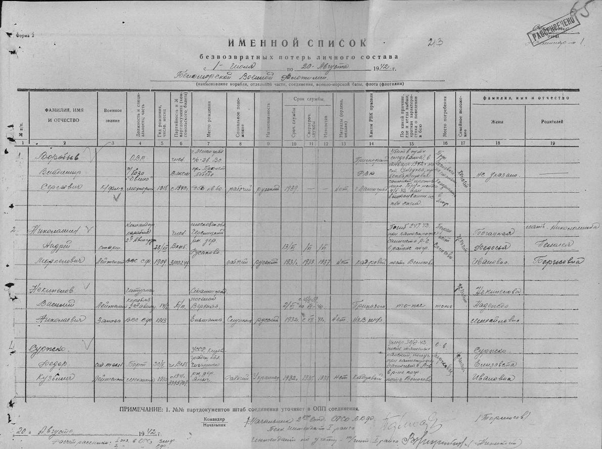 При катастрофе погибли командир корабля старший лейтенант Николашин Андрей Маркович и штурман корабля лейтенант Некипелов Василий Николаевич. Позже - 30.07.1942 в госпитале умер от полученных при катастрофе ранений механик старший техник лейтенант Суржко Федор Кузьмич.