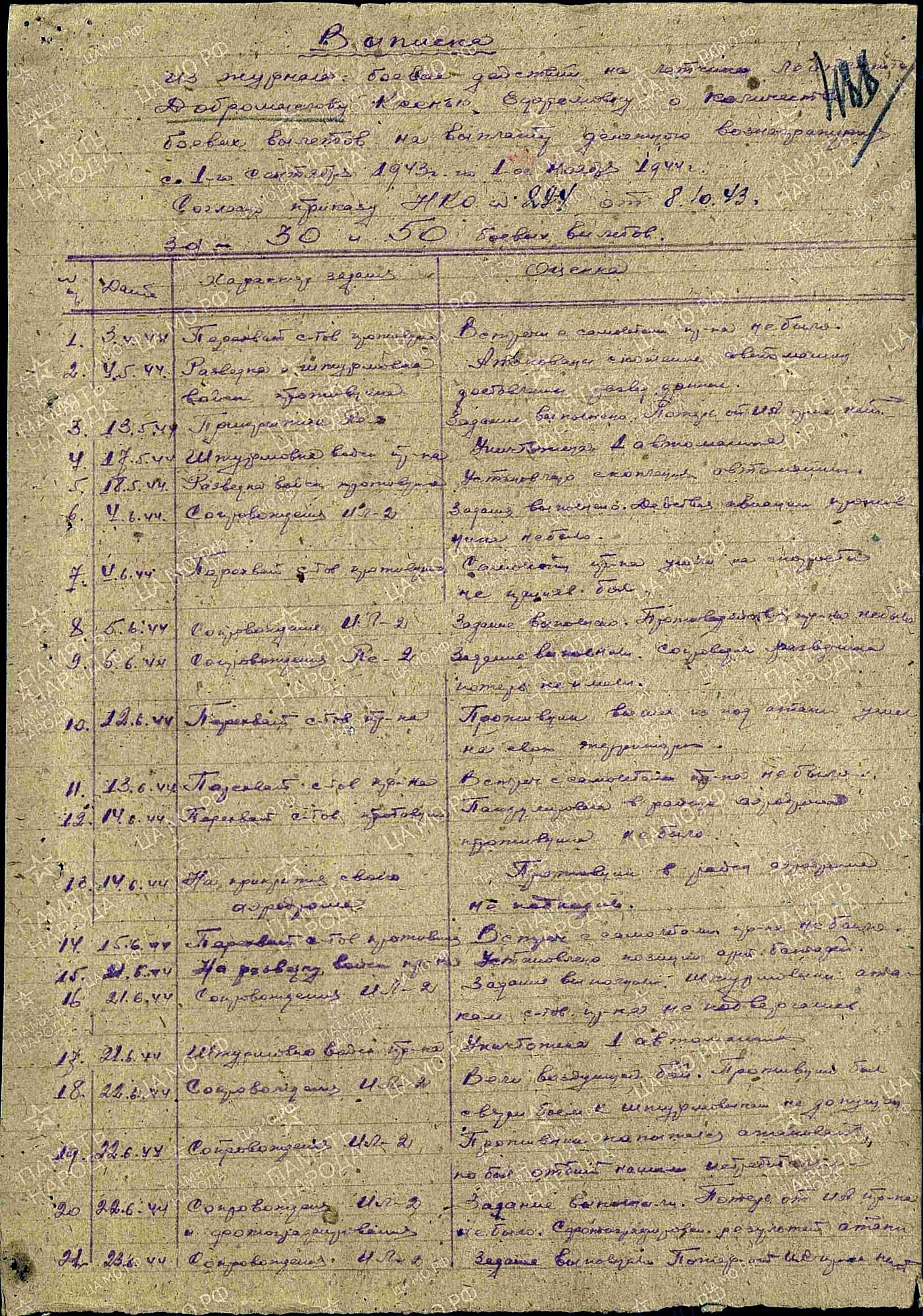 Выписка из журнала боевых действий на летчика лейтенанта Добромыслову Ксенью Ефремовну количестве боевых вылетов на выплату денежного вознаграждения согласно приказа НКО № 294 от 8 октября 1943 г. за 30 и 50 боевых вылетов: