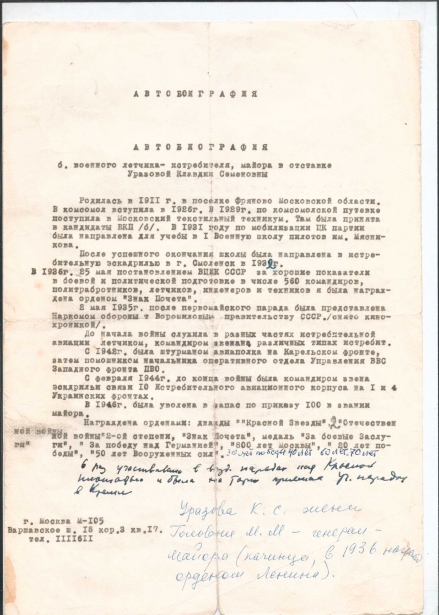 Клавдия Семёновна Головня (Уразова) 1911 г.р. майор . В 1933 г. закончила Качинскую военную авиационную школу по специальности летчик-истребитель. Очень скудные сведения о периоде её службы в авиации Карельского фронта. В своей автобиографии (см.ниже) она этот период прописала вскользь - штурман авиаполка. Скорее всего это с связано с должностями её мужа Головни Михаила Михайловича - в начальный период ВОВ командира 147 иап, 1 сад, командующий ВВС 26А, 258 иад Карельского фронта. Судя по сведениям в Памяти народа её период службы в авиации 7 Воздушной армии следует связывать с авиационным подразделением, о котором в сети также довольно скудно и противоречиво прописано - 9 отдельный смешанный учебно-тренировочный авиационный полк упоминаемый в источниках в разной аббревиатуре осутап, сутап, утсап и т.д., Место его базирования пока не известно. Можно считать, что боевая работа Клавдии Семёновны началась весной 42-го в авиации 7 ВА Карельского фронта.
