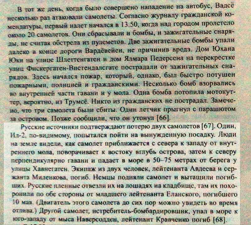 Нашел описание этого события а книге Харальда Риесто "Маленький город и война: Вадсё в 1941-1945 гг." на странице 76mexanik писал(а): ...останки экипажа 46 ШАП лейтенант Авдеев-сержант Маненков, погибшего в Вадсе 26.09.44г., изначально захороненные рядом с могилой Н.Н. Еланского...