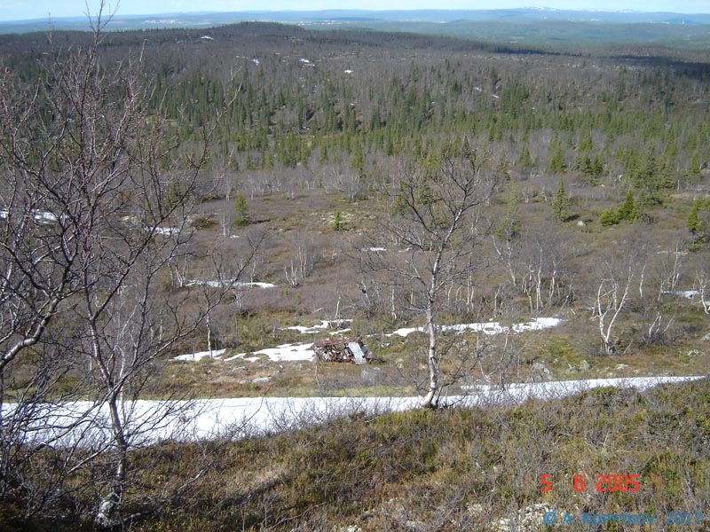 На склоне лежал только центроплан и несколько металлических конструкций от фермы фюзеляжа. При обследовании выяснили, что центроплан попал на склон около 20-30 лет назад – кто-то его сюда притащил. Осмотрев все детали на предмет обнаружения номера самолета, продолжили поиск места вынужденной посадки истребителя.
