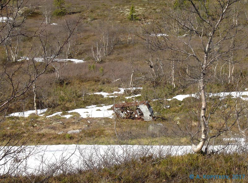 Летчик 2-й эскадрильи 27-го истребительного авиаполка ВВС Северного флота сержант САЛЬНИКОВ Борис Константинович, 08.10.1923 г.р., русский, место рождения: Северная Манчьжурия, г. Манчьжурия. Мать Сальникова Таисия Ивановна, проживала: г. Москва, Ленинская ЖД, ст. Вешники, Коммунистическая улица, д. 34. Добровольно зачислен в Военно-морское авиационное училище им. Сталина в ноябре 1940 года. Возвращаясь из похода в сторону автодороги Мурманск – Санкт-Петербург, на берегу небольшого озера обнаружили завалившуюся старую рыбацкую землянку, а рядом, сруб ледника, крышкой которого служил выпрямленный верхний капот «Харрикейна». Следов пожара на нем тоже не было. Очевидно, что во время посадки на каменистый склон самолет разрушился и летчик погиб. Хвостовое оперение, слетевшие капоты и мотор от огня не пострадали, а центроплан с кабиной были частично уничтожены во время пожара.