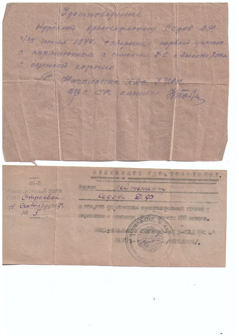 Удостоверения на совершенные прыжки с парашютом, выданные сначала курсанту 3-го УАП Седову Дмитрию Филипповичу, а затем уже летчику 3-й АЭ 46 шап лейтенанту Седову Д.Ф. в разные годы.