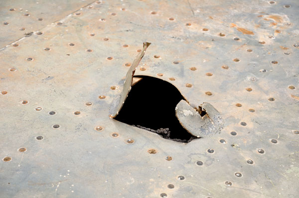 Далее видны попадания 88мм зенитки на правом крыле, от разрыва гранаты 88мм сверху-сзади, которая попала в качалку элерона на правом крыле - после чего мы думаем, что повреждение качалки не давало отклонять ручку управления полностью. Пробита и обшивка, и лонжерон, и качалка разворочена, так что управление было тяжелым. На левом крыле тоже есть следы крупного разрыва на щитке. Больше от крупных калибров на самолете ничего нет.