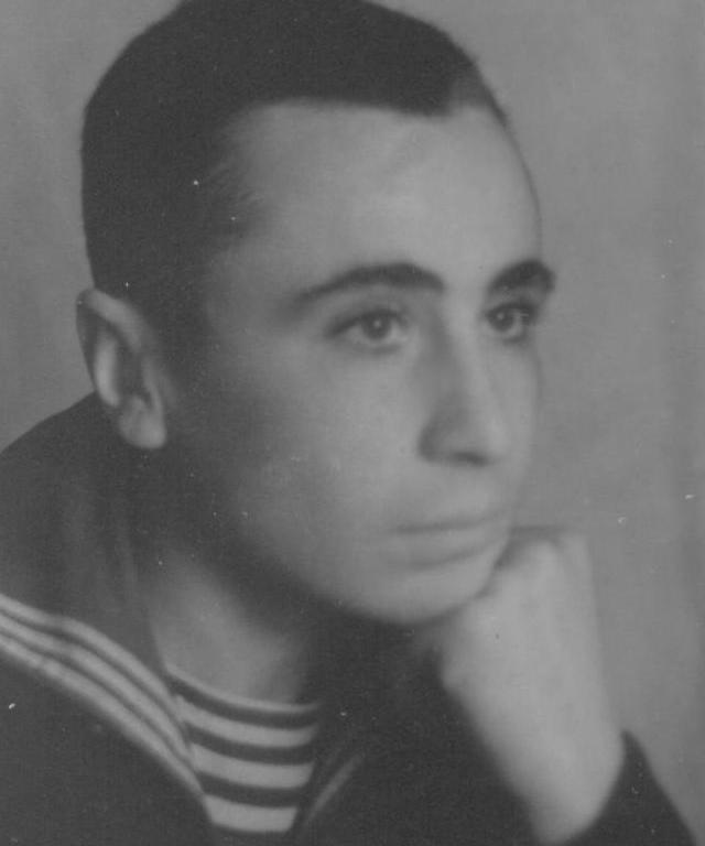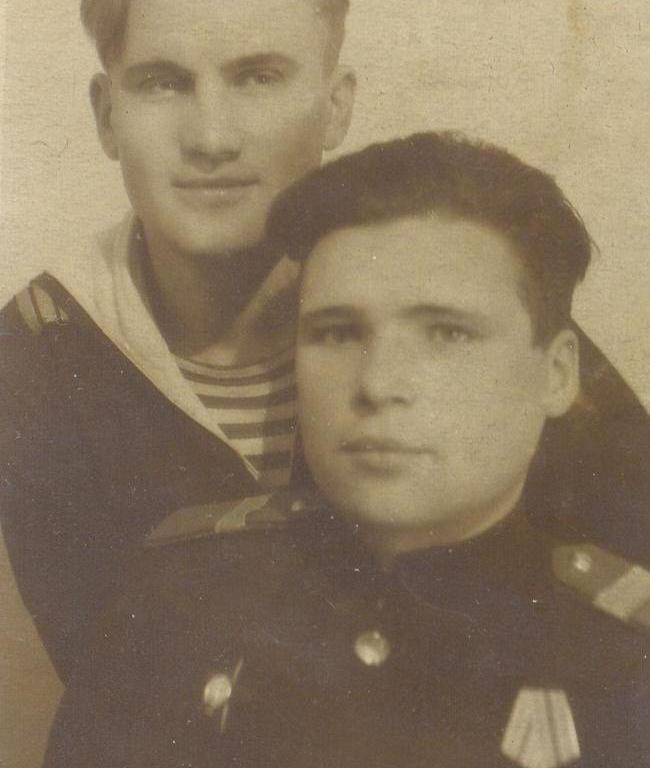 Послевоенное время. В неуставных брюках клеш. Уверен, что ширина брюк в нижней точке - не менее 40 сантиметров. Матросский шик!