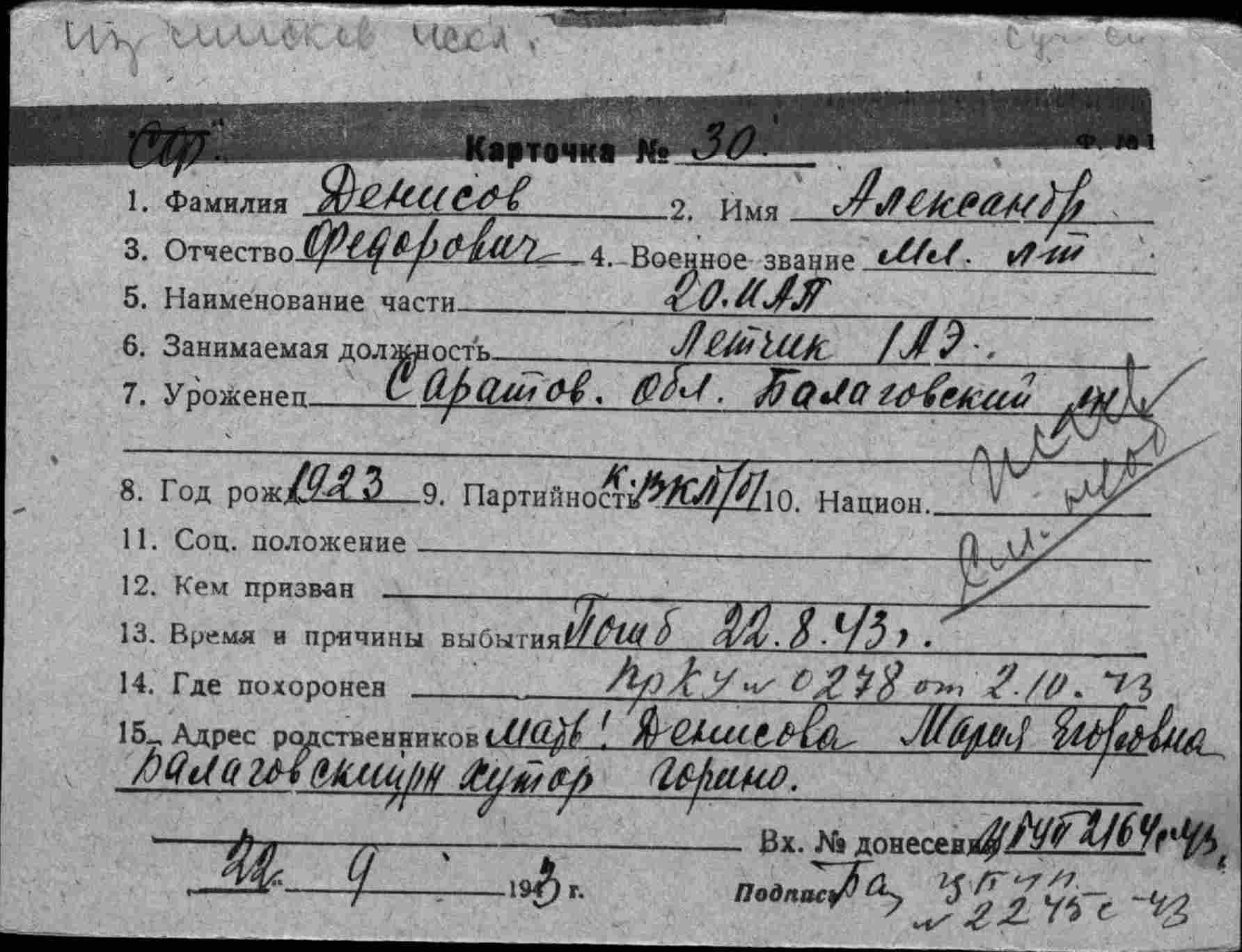А вот Личная карточка Денисова (с указанием 20-го ИАП ВВС СФ)