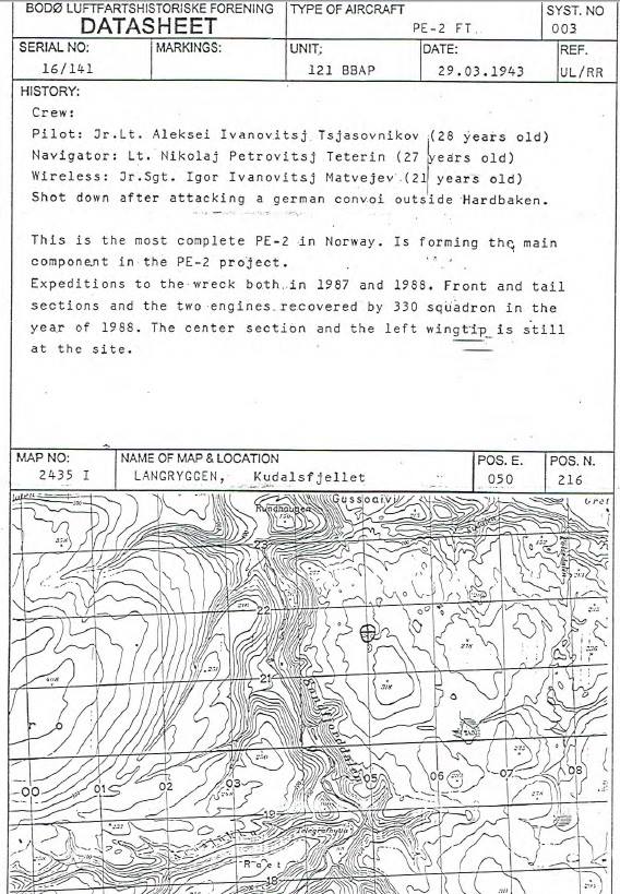 "На всем ветрам пик прилегающей Хамнингберг было в течение многих лет Русская бомбардировщик с последней войны. Он был использован в качестве места для дней людей в области, в то время как наиболее никогда не думал об этой истории, которая лежала за этой плоскости. Откуда она взялась из, когда он был сбит, и что случилось с командой? Вот история из плоскости Kudalsfjellet по Хамнингберг. От мой знакомый, который живет в Финляндии, Карл Фредрик Geust, у меня есть некоторая информация о экипажа этого самолета. 29 / 3-1943 был этот самолет и восемь друга на миссии, чтобы бомбить лодки в Kongsfjord области. Этот самолет с серийным номером 16/141 был атакован Messerschmitt Bf-110 и был настолько травмирован, что аварийная посадка не была, чтобы избежать. Самолет совершил вынужденную посадку на горе, на восток Хамнингберг в Финнмарк. Телеграфист на борту был ранен во время боя и были заброшены в плоскости, хорошо упакованной, и с шоколадом рядом с ними. Позже он был найден мертвым людьми из Хамнингберг Кто был первым на плоскости. Два других начал ходить, чтобы попытаться вернуться домой. После шести дней в бегах, они были установлены, и штурман был застрелен, а пилот попал в плен. Из отчета пилота во время допроса:   Это была его (пилот) Первая экспедиция против врага, и на этом рейсе, он был взят в плен. Экипаж на борту были: Flyver младший Лейтенант Алексей Iwanowitsch Tshasonikow 28 лет, пилот и штурман лейтенант Николич Petrowitsch Тетерин 27 лет и телеграфист младший Сержант. Игорь Ivanovitsch Matvejew 21.   Командир полка капитан. Mironitschenkos миссия была девять PE-2 самолета из другого крыла снизить сосудов Kongsfjord область. Во время этой миссии был Петляков 16/141 сбит Messerschmitt Bf-110, и аварийной посадки. Самолет упал обе свои 250 кг бомб в Конгсфьорде. Старшина Matvejew были ранены / убиты во время боя. О других планах он мог только сказать, что они сделали поворот и направился на восток. План для аварийной посадки пытался бежать на юг вдоль Варангер-фьорда до Petsamoveien и далее на свою сторону границы. Они пошли в Hammernes и пришел в с пожилой норвежской женщины, Эллен Перссон, который жил в одиночестве. Там они попытались объяснить ей, что они были голодны, и она дала им хлеб и молоко. Таким образом, они легли спать на полу ее дома с инструкциями к пробуждению kl.04.40. После того как она проснулась их они были поданы горячий чай и какао, и они попросили ее показать их на карте, где они были. Таким образом, они продолжили свой путь на северо-запад. После около четырех они пришли в дом, где они пытались войти без успеха. Время было около 0600. Как они продолжали свою прогулку, пошли человека из дома до ближайшего немецкого позиции и вошел в них. Именно тогда 0700.   В начале допроса, отказался Tshasonikow для него вообще был в контакте с кем-то. Немецкий отряд последовал по стопам русских и забрали их приблизительно 500 ярдов к северу от Gornitak. Когда лейтенант Тетерин не был достаточно быстр, чтобы поднять руки, он был застрелен. Обе русские были вооружены пушками, и у них был пакет с 8 шоколадные печенья, 9 банок сгущенного молока, и пачку сахара (все российского производства). У них также был компас, две карманные часы и российские деньги и различные документы.   Старшина Матвеев, который был ранен / убит во время боя, что осталось от самолета, который был разрушен во время аварийной посадки. Был также обнаружили четыре пулеметы, радио, карты, и т.д. .. Алексей Ivanowit
