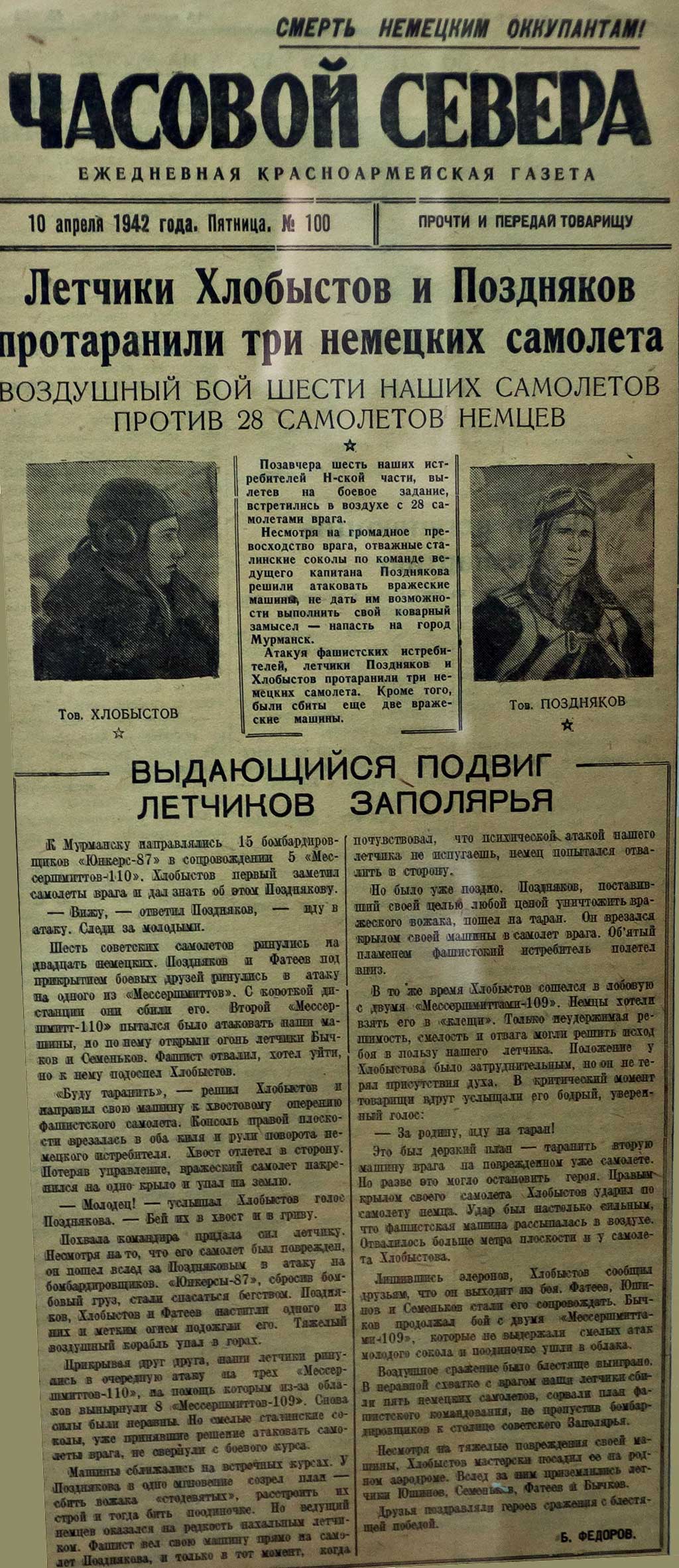 Кроме газеты Тор в своем сообщении выложил еще и схемы указанного боя.8 апреля 1942 года командир эскадрильи 20-го гвардейского истребительного авиационного полка (1-я смешанная авиационная дивизия, ВВС 14-й армии, Карельский фронт) гвардии капитан Поздняков А.П. вылетел во главе шестёрки истребителей P-40 "Томахок-IIB" на отражение налёта вражеской авиации на Мурманск. В районе посёлка Рестикент советские лётчики перехватили 15 немецких бомбардировщиков Ju-87 в сопровождении 5 истребителей Me-110. Разгорелся неравный воздушный бой. С первой же атаки Поздняков сбил "мессершмитт". Другого сбил таранным ударом гвардии лейтенант Хлобыстов А.С. Но враг продолжал рваться к Мурманскому порту. Главной задачей теперь стало не допустить к объекту бомбардировщики и наши лётчики обрушили на них свои атаки. Бросив как попало бомбы, немцы стали уходить со снижением на свою территорию. Преследуя их, Поздняков в группе с Хлобыстовым и гвардии лейтенантом Фатеевым И.Д. подожгли один "юнкерс". Неожиданно из облаков выскочила ещё восьмёрка "мессершмиттов". Поздняков повёл на них свою группу в лобовую атаку. Когда головные машины были уже рядом, враг не выдержал и попытался отвернуть в сторону, но не успел. От лобового тарана "мессершмитт" разлетелся на куски. При таране капитан Поздняков погиб.