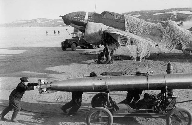 Торпедисты подвозят торпеду к самолёту Ил-4Т. Подготовка торпедоносца из состава 24-го МТАП к вылету Ваенга.jpg