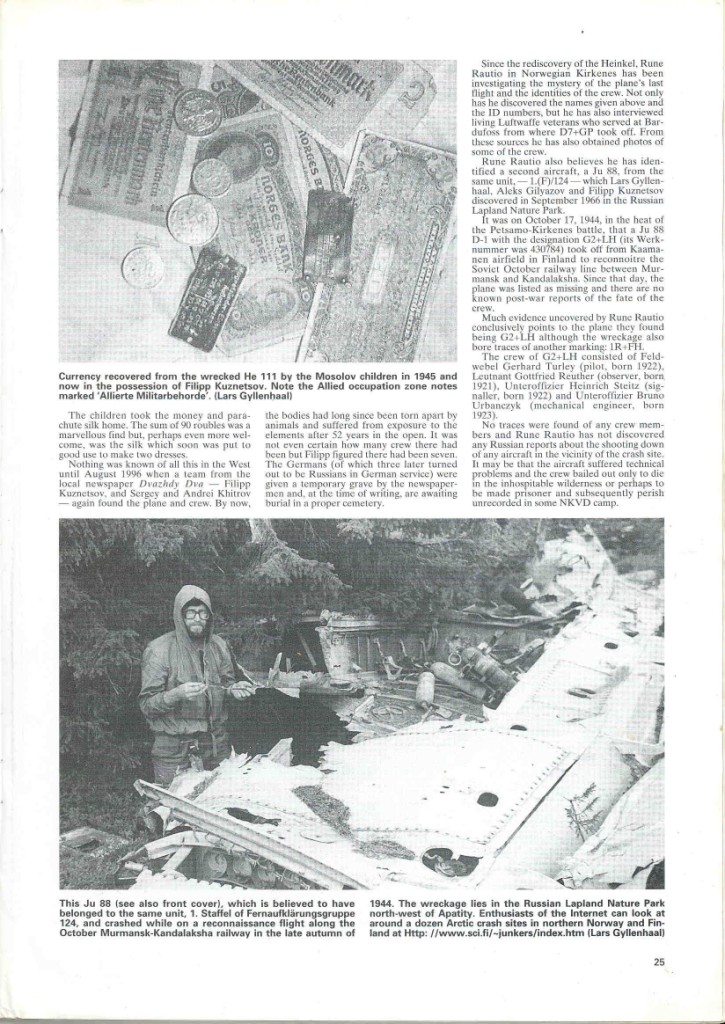 В редакции газеты "Дважды-два" города Апатиты работал Филипп Кузнецов. В английском журнале статья об обнаружении двух самолетов - Хейнкель-111 и Юнкерс-88. Филипп организовал походы на места крушений этих самолетов. К Юнкерсу в заповедник они ходили пешком трое суток и тоже в сопровождении работников заповедника. А статья появилась благодаря нашему с Филиппом общему знакомому - шведу Ларсу Гюлленхааль, который в то время работал в Мурманске и тоже увлекается историей.