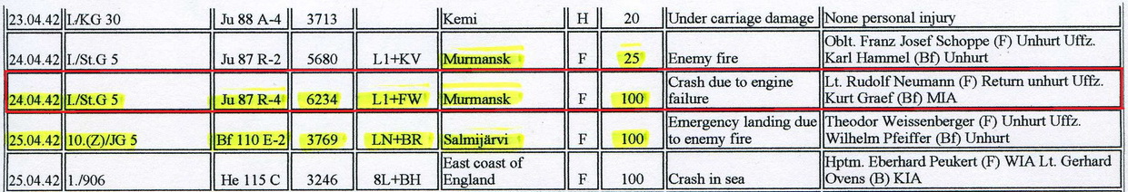 Юнкерс из I/St.G 5 подбит 24.04.42. над Мурманском. Упал на западном берегу озера Шовнаявр. Экипаж: пилот Lt. Rudolf Neumann вернулся в часть; радиооператор-стрелок Uffz. Kurt Graef пропал без вести.