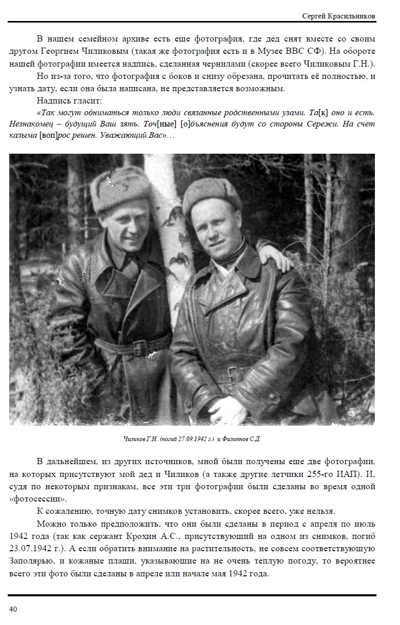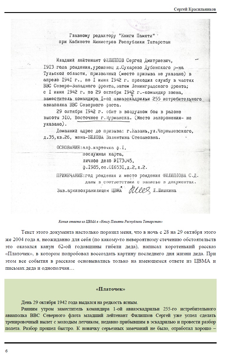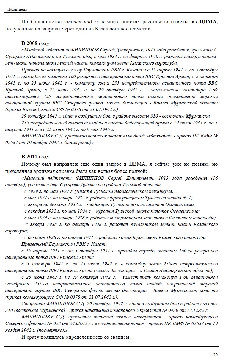 «Младший лейтенант ФИЛИППОВ Сергей Дмитриевич, 1913 года рождения, уроженец д. Сухарево Дубенского р-на Тульской области, призванный (место призыва не указано) в апреле 1941 года, по 1 июня 1942 г. проходил службу в частях ВВС Северо-Западного, затем Ленинградского фронта; с 1 июня 1942 г. по 29 октября 1942 г. – командир звена, заместитель командира 1-ой авиаэскадрильи 255 истребительного авиаполка ВВС Северного флота.