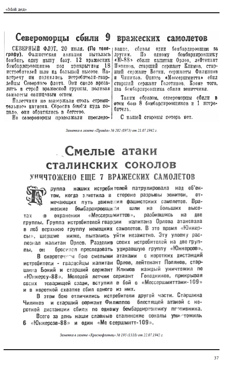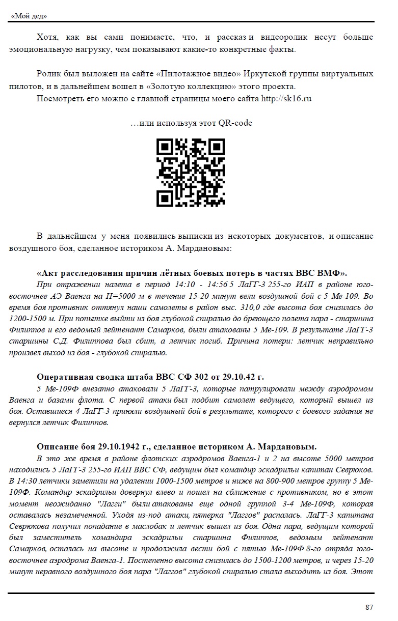 Примерно так мне говорили, когда я был маленьким. И такие слова, в общем-то, понятны. Женщины (после гибели Филиппова Сергея в воздушном бою в 1942-ом году, у него остались жена и две дочери) часто склонны героизировать своих мужчин. И неважно кого - сына, мужа, брата, отца, деда... Это делается неосознанно, из-за большой любви к ним. И иногда в дальнейшем это перерастает в слепую веру, что всё было именно так, как было додумано...