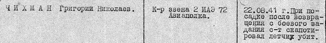 Мой дядя - лейтенант Григорий Николаевич Чихман, командир звена 2-й эскадрильи 72-го САП погиб 22 августа 1941 г. по возвращению из воздушного боя, аэродром Ваенга.