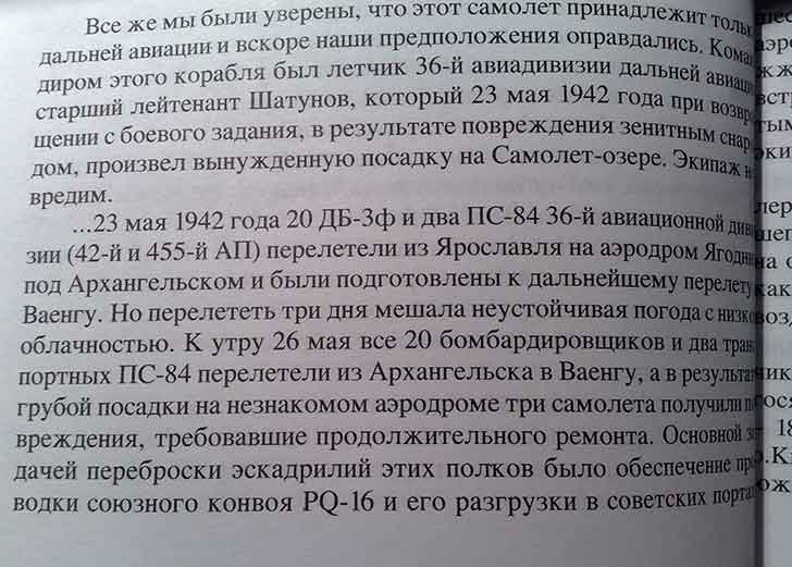 В 20-х числах мая 1942 года в 36 дивизию прибыл заместитель командующего авиацией дальнего действия генерал-майор Н.С. Скрипко. Ставка поставила перед нами задачу обеспечить беспрепятственный проход караванов морских судов союзников в порты Мурманска и Архангельска. Командующий АДД поручил выполнение этого важного задания 36-й авиадивизии. Оперативную группу возглавил командир соединения полковник В.Ф. Дрянин… …20 мая 1942 года 26 лучших экипажей из дивизии перебазировались на один из северных аэродромов Ваенга-1. В связи с важностью боевые задания экипажи должны были выполнять при ряде трудностей и особенностей самого театра военных действий. Климатические условия крайнего севера часто меняются. Местность здесь безориентирная, населенные пункты редки, ландшафт однообразный. Летом день на севере длится беспрерывно, а зимой круглосуточная ночь. Аэродромов не хватало. Да и те, что имелись, не всегда были удобны для выполнения боевых заданий. В этих условиях 20 мая 1942 года оперативная группа должна производить посадку на один из аэродромов Заполярья. Данных об аэродроме не было. Посадку самолетов должны производить на незнакомом аэродроме. Суровое Заполярье встретило наш экипаж большой поломкой самолета. Посадку самолета произвели как всегда хорошо. Но когда настало время при пробеге тормозить самолет, то оказалось, что тормозная система замерзла в воздухе. Самолет быстро пробежал короткий аэродром и перед нами оказался большой обрыв. Самолет должен капотировать, а экипаж погибнуть. Но к нашему счастью на краю обрыва стоял пень, на который левое шасси и наехало. Самолет, развернувшись вправо юзом, стал ломать деревья в овраге. Двигатели были сорваны, плоскости и хвостовое оперение отвалились, ноги шасси сломались. Экипаж остался в своих кабинах. При медицинском осмотре установлено, что из четырех членов экипажа даже никто и царапины не получил. Разбитый самолет остался в овраге. Инженеры заключили, что нет смысла его вытаскивать из оврага. Сотни раз был рядом со смертью и сотый раз я уходил от нее невредимым…»