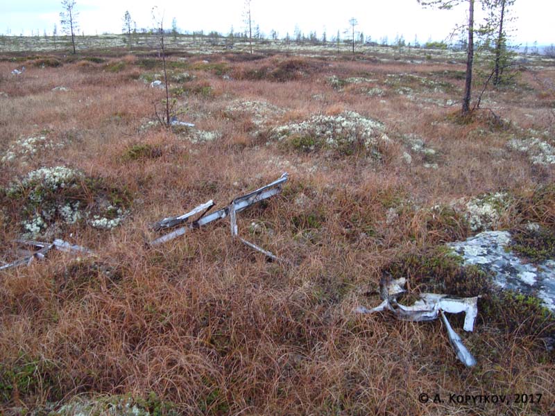Рядом с местом удара самолета в сопку из болота выступают остатки мотора.