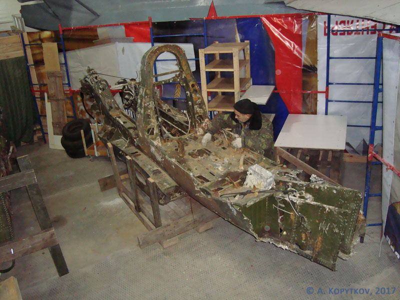 Восстановлением истребителя занимается штатная техническая группа музея. Для удобства проведения работ, из подручных материалов изготовили подставки фюзеляжу и деталям крыла. В ноябре проводили работы по очистке конструкции от донных отложений и коррозии. Из фюзеляжа выгребли несколько ведер песка и ржавчины. Еще снимки фюзеляжа, сделанные в ноябре 2016 года.