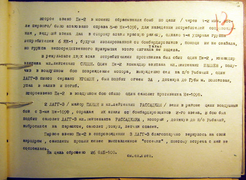 2. Самолет Пе-2. Экипаж невредим: летчик – пилот 2-й АЭ (с 03.1942г.) мл.л-нт Ивлиев Георгий Васильевич, канд. в чл.ВКП(б) с 1942г., ВМАУ им.Сталина в 1940г. На Пе-2 летает с 23.03.42г., налет – 100 час. Общий налет – 962 час, из них: днем – 952 час., ночью – 3 час., по приборам – 2 час. Общее количество боевых вылетов – 20. Штурман – воздушный стрелок-бомбардир (с 03.1942г.) с-на Серебряков Томас Васильевич, чл.ВКП(б), ВМАУ им.Леваневского в 1941г. На Пе-2 летает с 23.03.42г., налет – 100 час. Общий налет – 210 час. Количество боевых вылетов – 20.