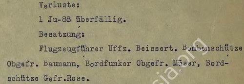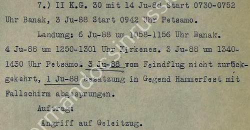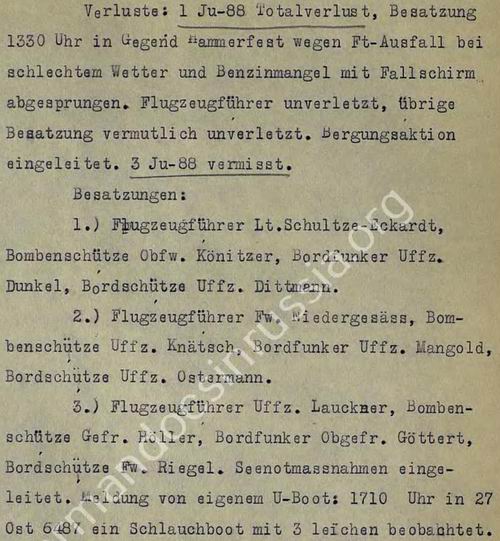 Первый из них Ju-88А-4 №182 пропал без вести вместе с экипажем, второй - Ju-88А-4 №1747 также пропал без вести в ходе выполнения боевого задания в море. Третий - Ju-88А-4 №0724 отмечен как потерянный в ходе выполнения боевого задания в районе атаки конвоя в море по причине «vermutlich absturz», что в переводе означает «предположительно упал» (потеря в размере 100%), причем без указания какой-либо боевой причины, экипаж пропал без вести. Четвёртый - Ju-88А-4 №1771 отмечен потерянным (в размере 100%) возле аэродрома Банак в ходе выполнения боевого задания по причине «notlandung infolge motorschaden», что в переводе означает «вынужденная посадка вследствие повреждения двигателя», причем также без указания какой-либо боевой причины, при этом экипаж также пропал без вести, Пятый - Ju-88А-4 №1478 отмечен потерянным возле Хаммерфеста в ходе выполнения боевого задания по причине «absturz infolge brennstoffmangel», что в переводе означает «падение вследствие недостатка горючего», экипаж спасся на парашютах, но первопричина, приведшая к полной выработке горючего не указывается. Ни в одном из пяти случаях нет записи, что самолёты были сбиты зенитной артиллерией, несмотря на то, что в боевом донесении 5-го Воздушного флота по горячим следам чётко отмечено, что все пять уничтоженных Ju-88 в этот день были потеряны в ходе атак по конвою: 4 Ju-88 записаны как пропавшие без вести (имеются в виду Ju-88А-4 №182, №1747, №0724 и №1771); пятый Ju-88 (имеется в виду Ju-88А-4 №1478 из 4-го отряда потеря в размере 100%) в боевом донесении отмечен потерянным по причине «Ft-Ausfall», что в переводе означает отказ (авария, выход из строя) радиоаппаратуры или радиостанции, что привело к потере ориентировки в плохую погоду, полной выработке горючего и покиданию самолета экипажем на парашютах в районе Хаммерфеста. С большой долей вероятности последний Ju-88А-4 №1478 можно также считать потерянным из-за боевой причины повреждения радиоаппаратуры зенитной артиллерией, хотя об этом в боевом донесении четко не сказано (отмечен только отказ, авария). Эти «Юнкерсы-88» были сбиты зенитной артиллерией кораблей наших союзников (эсминцы нашего Северного флота уже вернулись на базу после выполнения сопровождения на своём участке маршрута конвоя).