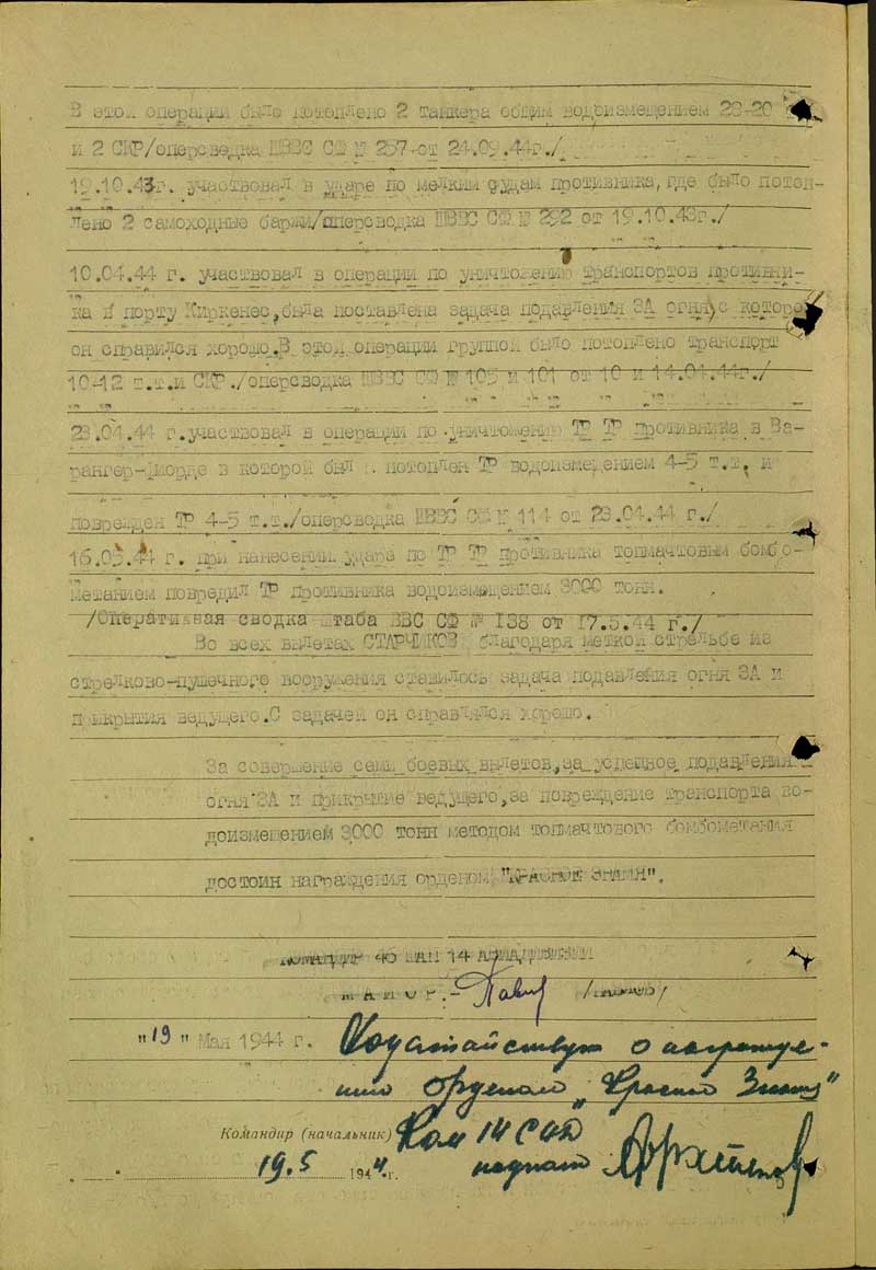 п.5. Летчика 2-й АЭ лейтенанта Старчикова Г.В. допускаю к исполнению должности Командира 3-го звена той же АЭ с 20 января 1945г.