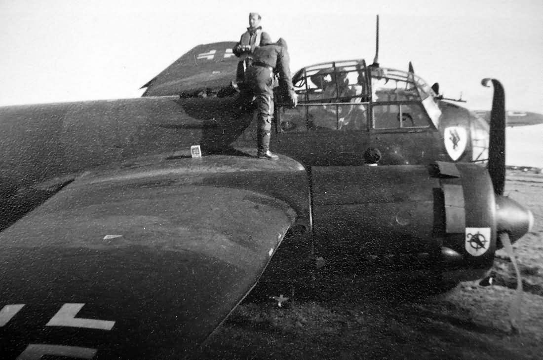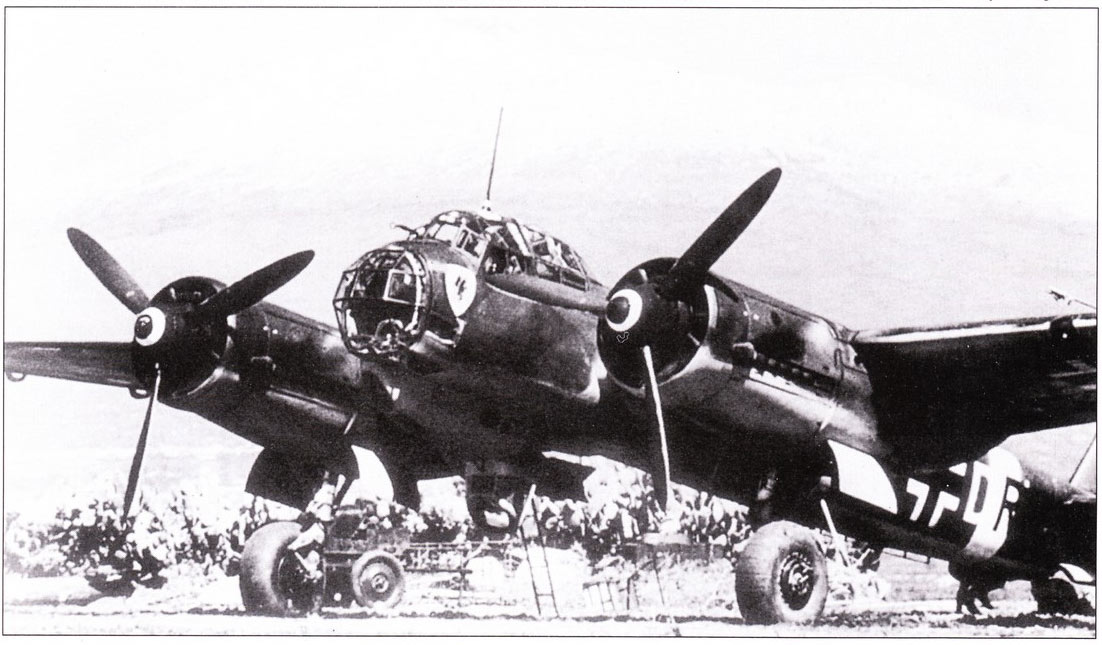 Снимок сделан на сицилийском аэродроме Гербини. На снимке хорошо видны элементы фонаря кабины и передняя подвижная пулеметная установка с пулемётом MG-81, а также эмблема KG-30 на борту фюзеляжа.