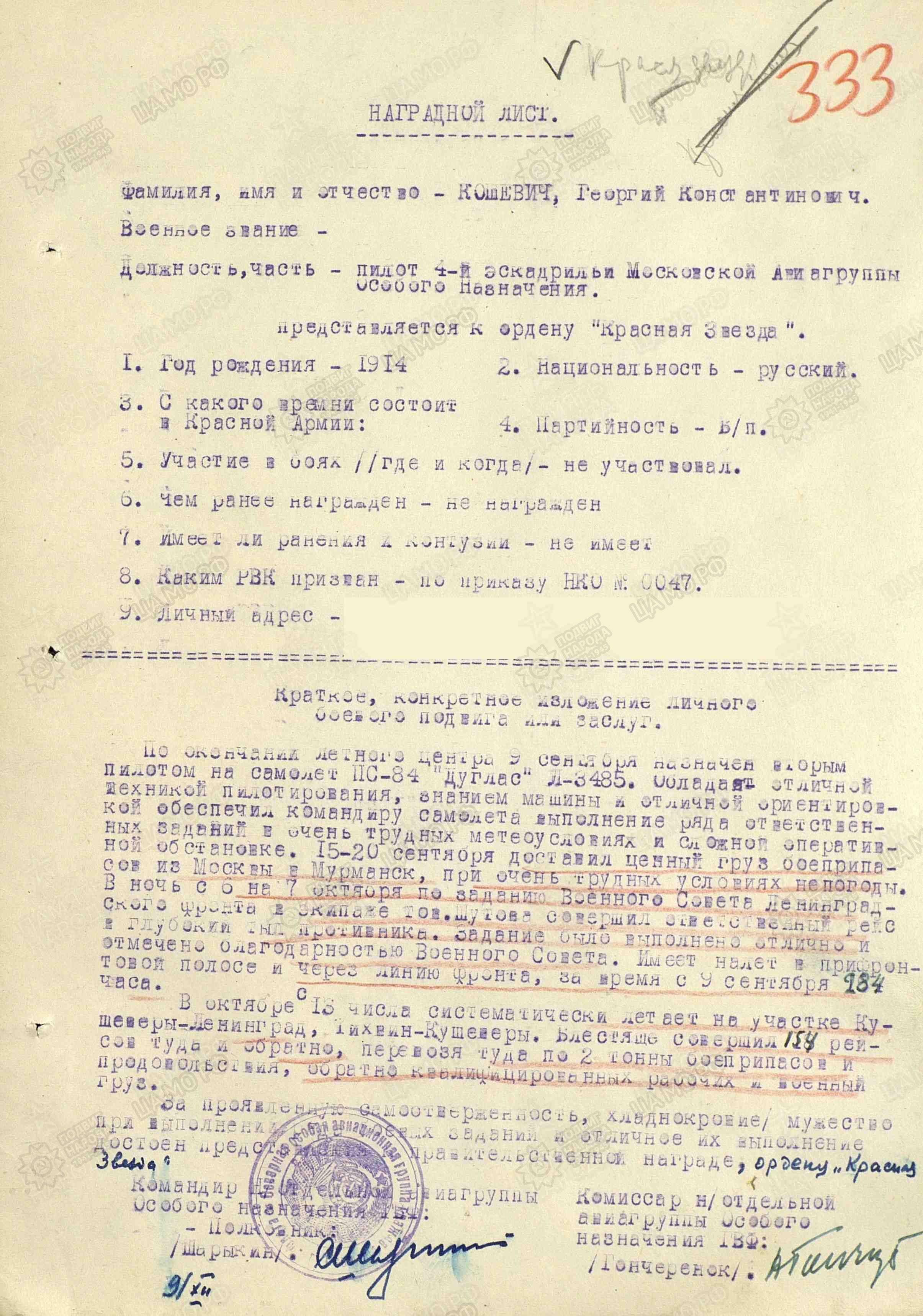 ...Основание: Извещение Московской авиагруппы № 14-90с от 21 июля 1941г.