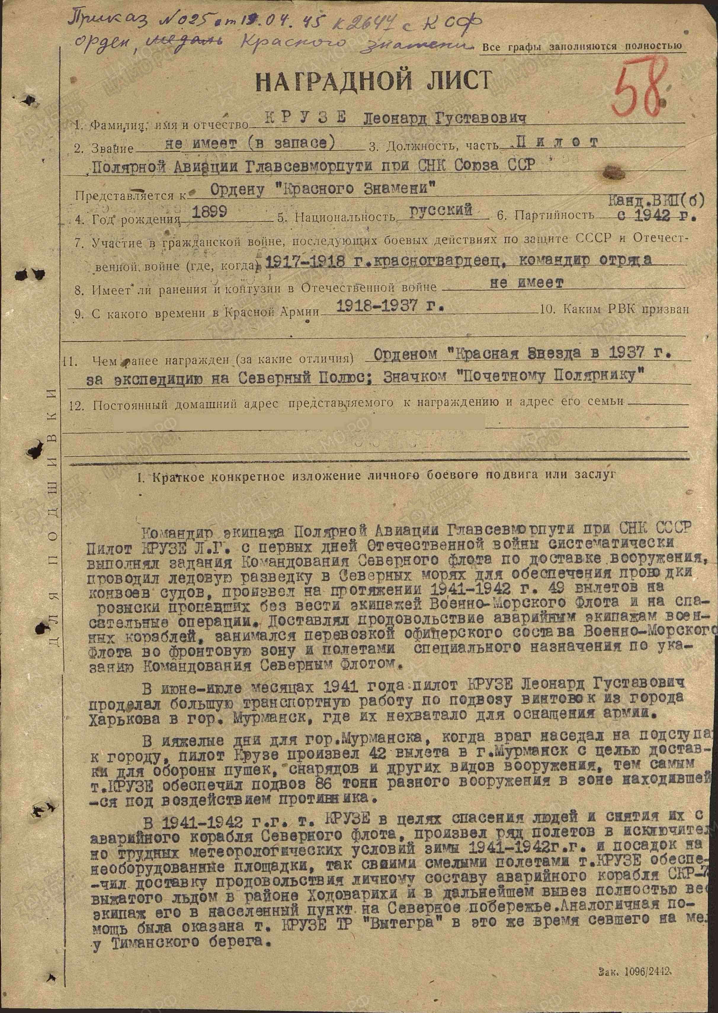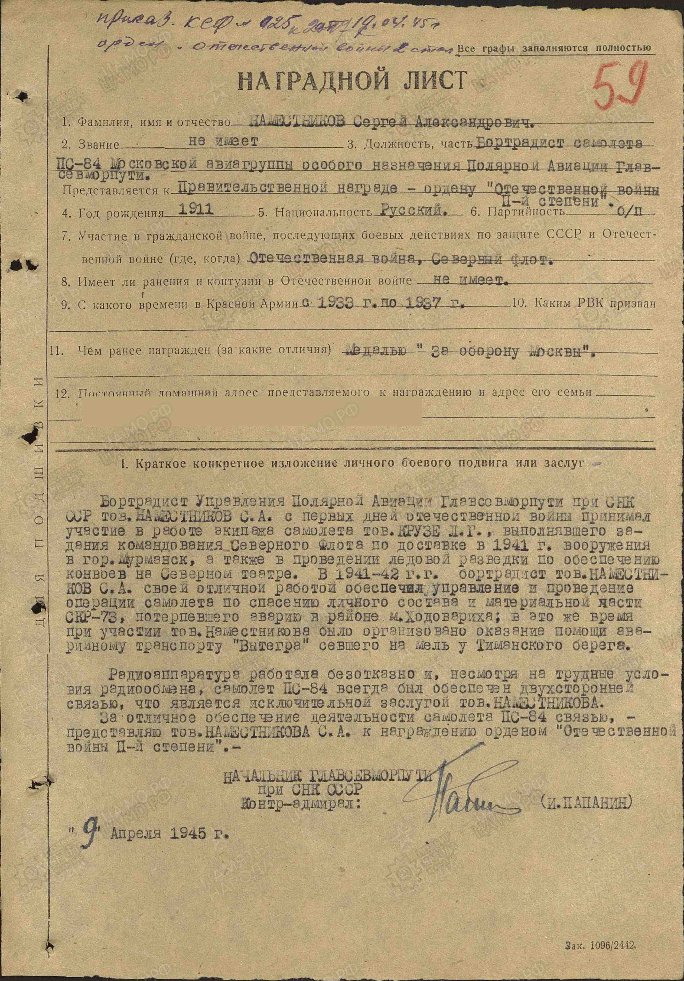 Одним из экипажей, доставлявших грузы в июне-июле 1941 в Мурманск, был экипаж известного полярного летчика Леонарда Крузе. Странно, что в его наградном место службы - полярная авиация ГСМП, а у Наместникова и Бесфамильного - МАГОН ГСМП (если сокращенно).