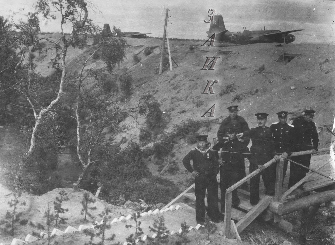 На фото на переднем плане Герой Советского Союза комэск-1 майор Гуляев Сергей Арсентьевич, на месте воздушного стрелка штурман и парторг эскадрильи старший лейтенант Казаков Алексей Прохорович.