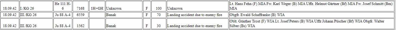 Два остальных самолета действительно были потеряны 18.9.42 во время вылета против конвоя. Юнкерс был из 9./KG 26, хейнкель из 1./KG 26. Бортовые номера соответственно 1T+FT и 1H+GH. Код 1Т у самолетов KG 26 не должен вас смущать, потому что III./KG 26 - это бывшая I./KG 28, переименованная в декабре 1941 г. После этого KG 28 перестала существовать. Наличие ее кодов на бортах юнкерсов - просто анахронизм, никто их не удосужился перекрасить. Это не первый такой случай, Ме-110 церштёрерштаффеля JG 5 тоже носили старые коды, например.