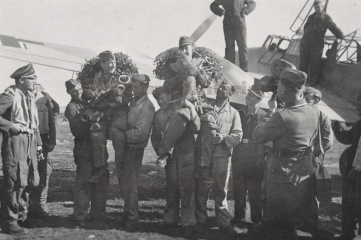 17.07.1942 Поздравление оберфельдфебеля Мундинга (Ofw Karl Munding)и унтерофицера Гунцельманна (Uffz Gunzelmann) после возвращения из 1500-го боевого вылета.