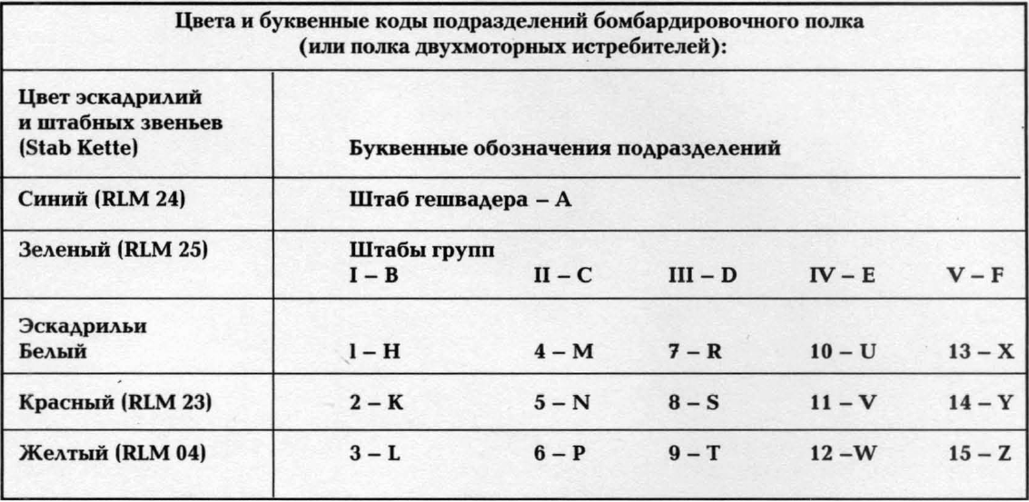 Поюс к бомберам можно добавить, что "Дополнительным обозначени­ем, облегчающим идентификацию ча­сти, была система окраски коков вин­тов - чаще всего их окрашивали цели­ком или частично в цвет эскадрильи, а иногда еще и носок кока окрашивали в цвет группы. Каждой группе в эскадре был присвоен цвет, который служил фоном щитка эмблемы соединения: I группа - белый, II группа - красный, III группа - желтый, IV группа - светло-голубой, V группа - черный."