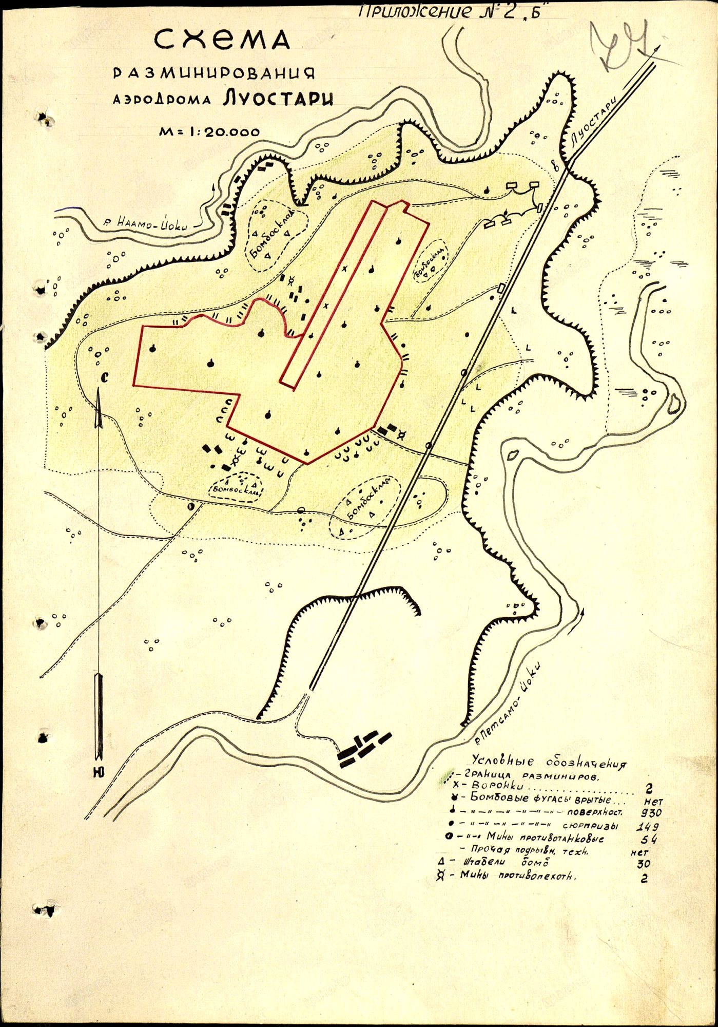 - Pontsalenjoki – посадочная площадка [Landeplatz] на правом берегу р.Понча – река протекает с З на В всего в 1,5 км севернее от пересечения ВПП. Площадка располагалась недалеко от п.Пяозерский, была построена немцами в течение 1941 г. и первой половины 1942 г. Имела 2-е грунтовые ВПП – длинную с В на З, и короткую – с С на Ю. Одна из 2-х ВПП вероятно была покрыта гравием или деревянным настилом. Стоянка самолётов из примерно 12 деревянных капониров была недалеко от ВПП, идущей с В на З – с её северной стороны. Данных о размерах аэродрома нет.