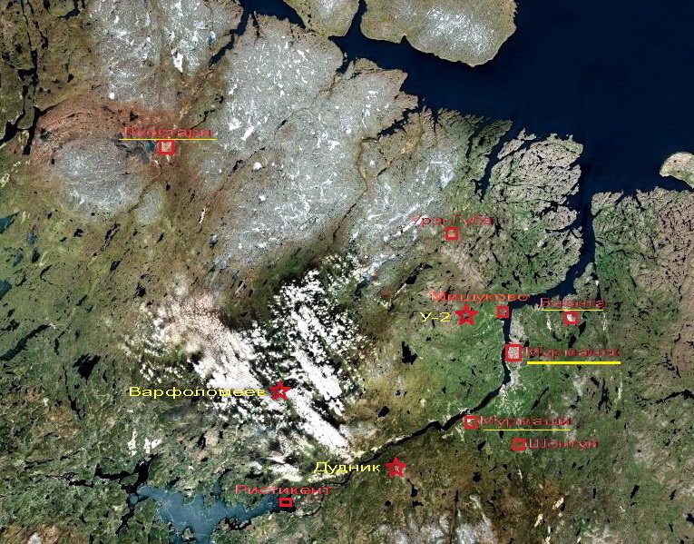 В районе Мишуково были сбиты только И-16 Соколёнкова и У-2 Ашмарина (в 9 км западнее). Ну и Чудинов, сбит огнём 5 озад ПВО СФ. Дудник подбит в 20 км юго-западнее Мурмашей (гора Гремяха), на полпути от Аэродрома до Ристикента. Там же, только на западном берегу Туломы, в р-не Юркино, Шашке или Дамер 7 июля собьют И-16 Чегаева. И-16 Варфоломеева вообще упал в 70 км юго-западнее Ура-Губы, куда он вылетал на перехват вражеских бомбардировщиков, в р-не горы Бол.Мочесвайвишь. Для наглядности картинка. Так что нельзя сказать, что немцы "пасли" в строго определённом месте.