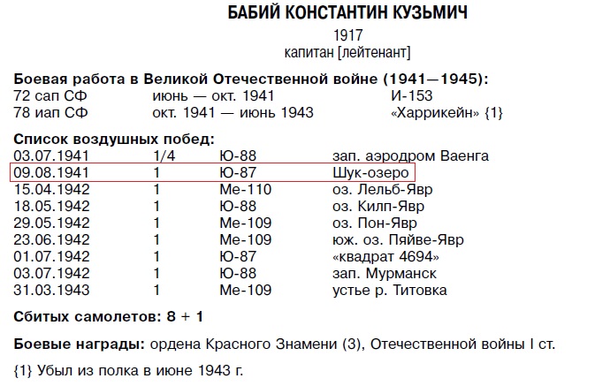 Посмотрел документы: в оперсводке ВВС СФ вообще нет сведений кто конкретно сбил самолёты, в журнале учета боевых вылетов 72 САП - победы лётчиков эскадрильи И-153, где служил Бабий, тоже не записаны. Есть запись в Историческом отчете ВВС СФ за весь день: "В воздушных боях - капитан Сафонов, летенант Сорокин сбили по 1 Ю-88 каждый. 4 Ю-88 сбили в группе ст. лейтенанты Воловиков, Алагуров, Родин, Плотко и мл. лейтенанты Максимович, Покровский, Бабий. Капитан Раздобудько, мл. лейтенанты Доронин и Бабий сбили по одному Ю-87 каждый". Получается, Бабий сбил лично 1 Ю-87 и в группе 1 Ю-88