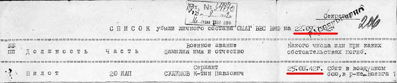 Однако наиболее вероятно все таки 25 августа, так как есть документ, в котором указана дата гибели Сулимова К.П. 25.08.1942 года и который датирован 22 сентября.