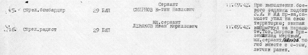 - Экипаж: старшина Ильченко П.П. - жив, сержант Смирнов Константин Павлович и младший сержант Леваков Иван Кириллович - погибли; - Экипаж: лейтенант Ивлиев Георгий Васильевич, старшина Серебряков Томас Васильевич, краснофлотец Филоненко Анатолий Васильевич - погибли все (о судьбе экипажа более подробно написано в теме "Пе-2 из 29-го БАП (оз. Санта-Ярви)");