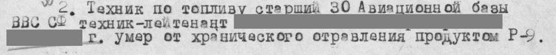Р-9 - это авиационный бензин со «специфическими» присадками розового цвета. Отец вспоминает, что если он вдруг определенное время задерживался в пассивном состоянии, допустим, в дюралевых всасывающих патрубках, подходящих к цилиндрам двигателя, то стенки патрубков окрашивались в ядовито малиновый цвет. И ни о каком «злоупотреблении» речи идти не может. И это точно «так называемые "издержки профессии", приведшие к отравлению и гибели...» бедного технаря.