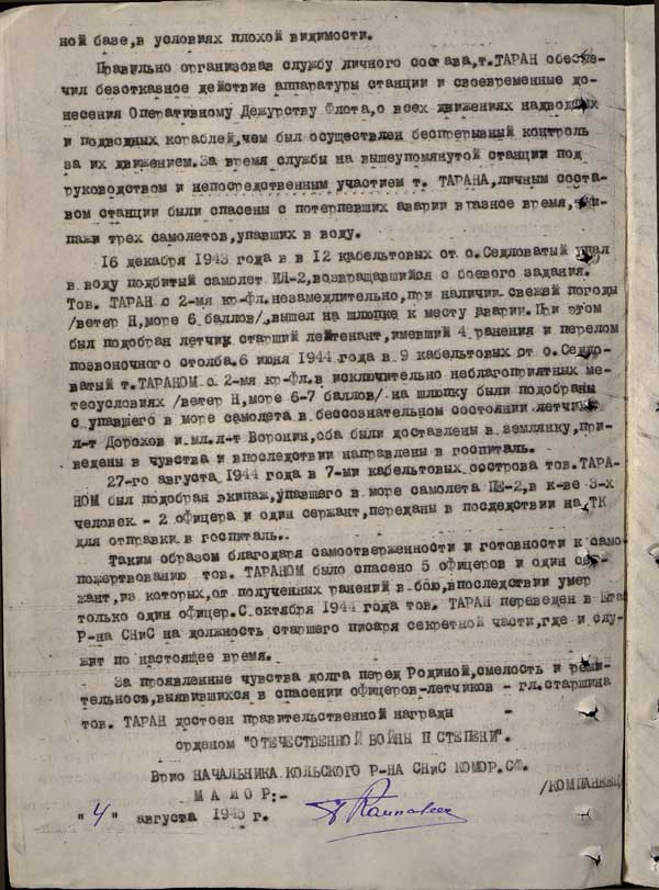 Тов. Таран с 2-ма кр-фл. незамедлительно, при наличии свежей погоды ветер Н, море 6 баллов ( скорость ветра 8,0—10,7 м/сек. по Бофорту) вышел на шлюпке к месту аварии. При этом был подобран летчик старший лейтенант, имевший четыре ранения и перелом позвоночного столба.