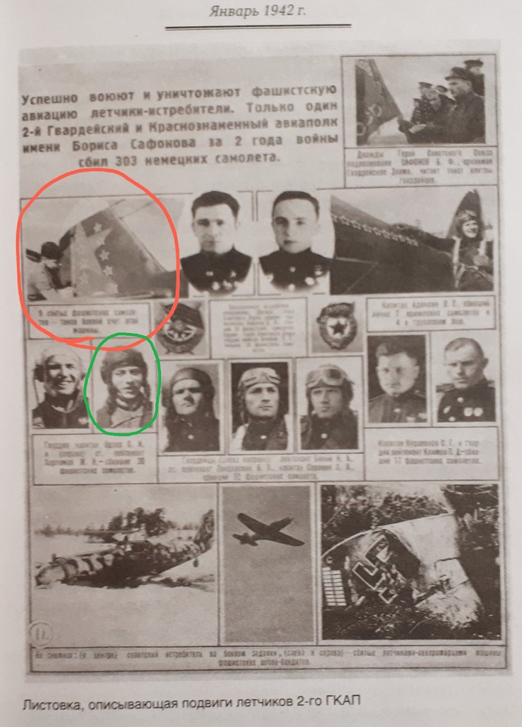 Интересно, что на этой листовке, посвященной 2-му ГвИАП, присутствует фото киля Як-1 из 20-го ИАП (обведено красным) и фото Харламова М.И. из 255-го ИАП (обведено зеленым).