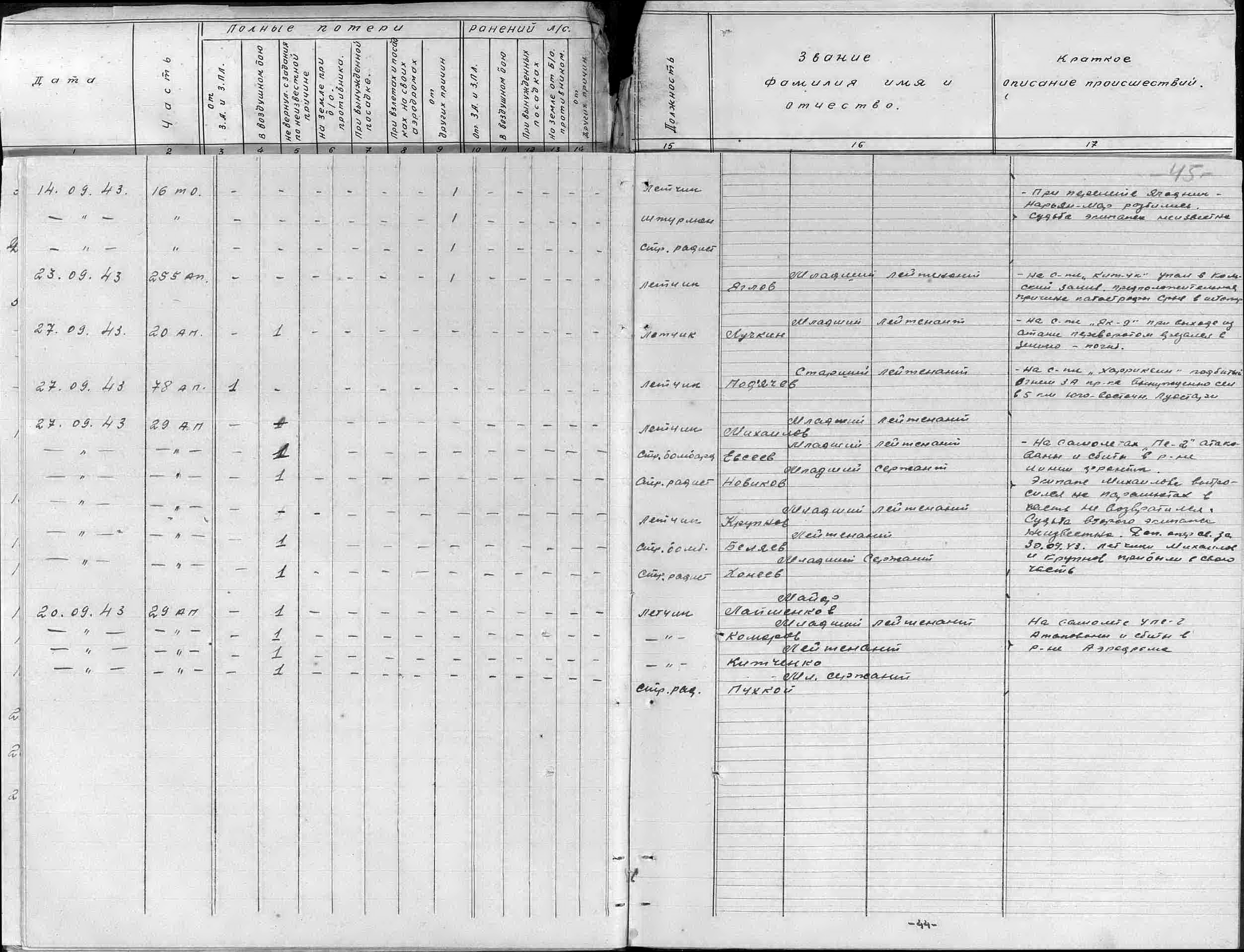 Николаев А.Ф. в 1943 г. не находится, но он у нас еще не до конца обработан. С 04.43 по 04.44 сделал всего 17 боевых вылетов. В 1943 г. точно был мл.лейт. Если его и сбили, он явно выжил и дослужился в 1945 г. до ст.лейт. и командира звена.