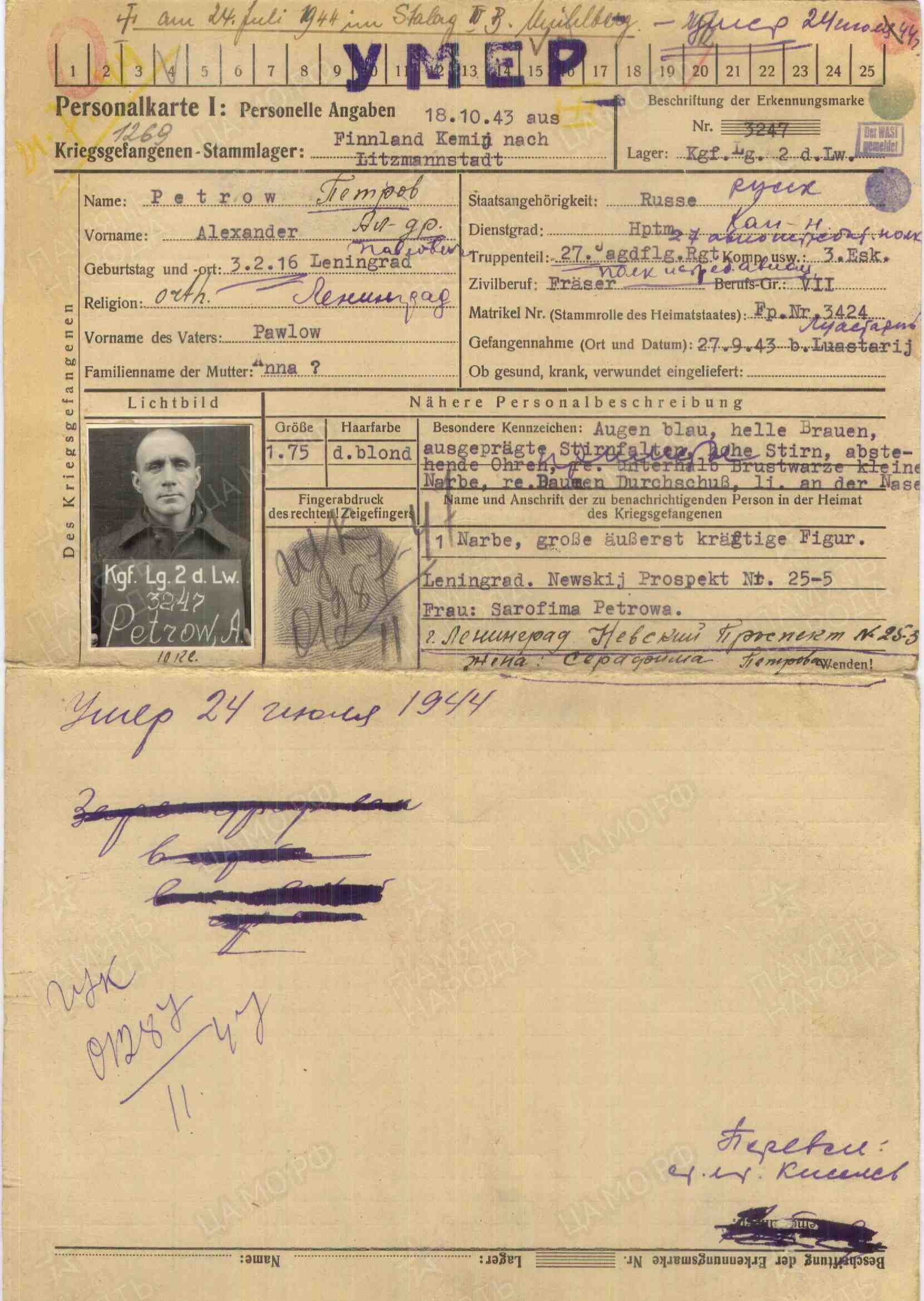 Только вот засада - в ОБД "Мемориал" я не нашёл в потерях ни одного лётчика Петрова Александра Павловича 1916 г.р., кроме этого нашего военнопленного...