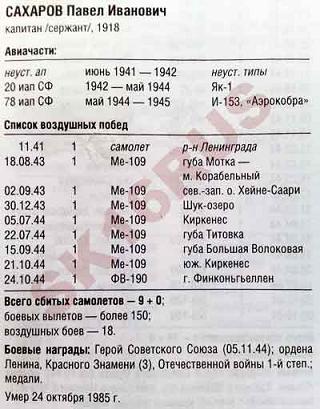 Вот после этого становится сразу интересно - а с кем это так результативно воевал, по мнению составителя биографии, Герой Советского Союза Сахаров П.И., если с ноября 1944 года, после Петсамо-Киркенесской операции, боевые действия в Заполярье фактически прекратились...К маю 1945 года на счету капитана Сахарова было 225 боевых вылетов и 12 лично сбитых самолетов противника. В результате боевой работы потоплено 2 транспорта, 1 каботажное судно, 5 мотоботов, уничтожено 2 батареи зенитной артиллерии, 13 автомашин, склад с боеприпасами.