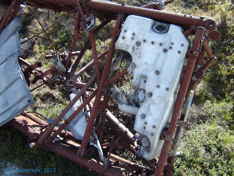 В центроплан между баками был положен один из капотов, закрывающий фюзеляж в районе кабины. На капоте не было следов огня. Скорее всего, его обнаружили где-то на склоне сопки и принесли сюда.